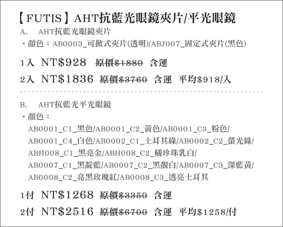 商品訊息簡述: 只要928元起(含運)即可購得【FUTIS】原價最高6700元抗藍光系列:(A)AHT抗藍光眼鏡夾片1入/2入/(B)AHT抗藍光平光眼鏡1付/2付。皆有多種顏色任選!